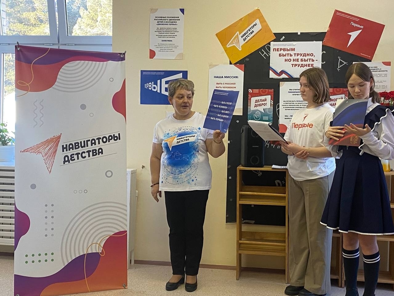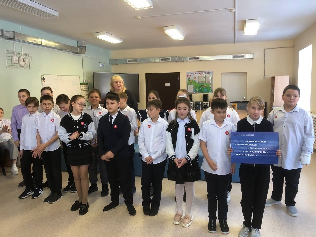Советник по воспитанию Лариса Анатольевна, приняла клятву от новых участников Движения, а активисты совета Первых торжественно вручили нагрудные значки Движения Первых.